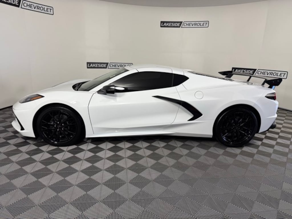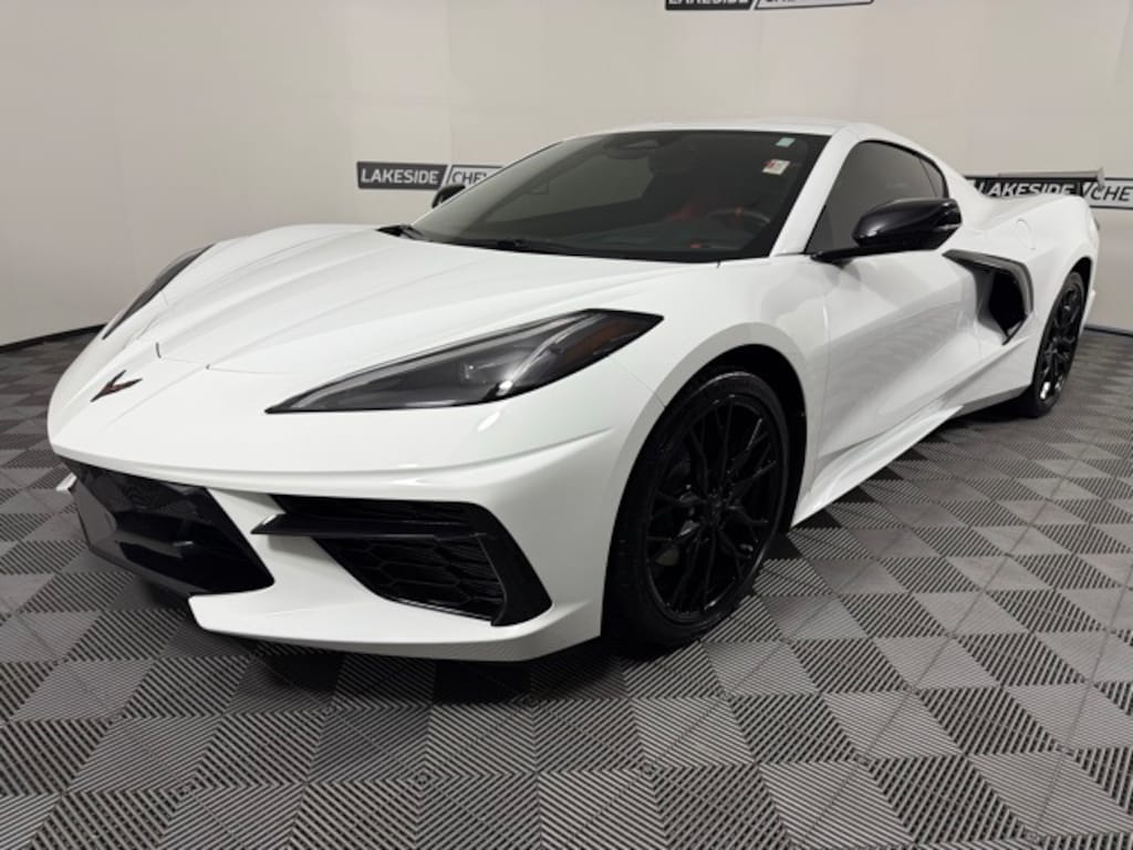 2025 Chevrolet Corvette Stingray 2LT has a one-owner clean CARFAX and is now at Lakeside. This Chevy sports car has the 6.2L V8 engine, 8-Speed Dual Clutch auto transmission, red leather, premium Bose audio, MBRP exhaust, memory seats, heads up display, wireless Apple Carplay, rear parking camera with parking sensors, heated steering wheel, hetaed and ventilated seats, remote starter, and steering wheel mounted audio controls. 495 horsepower.