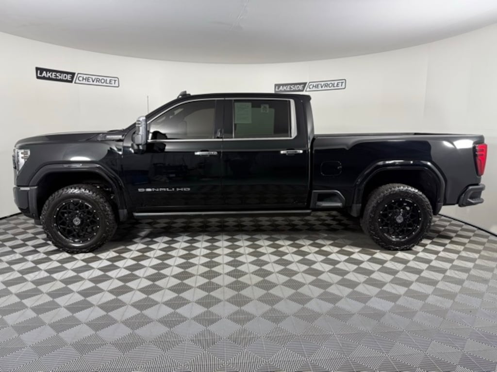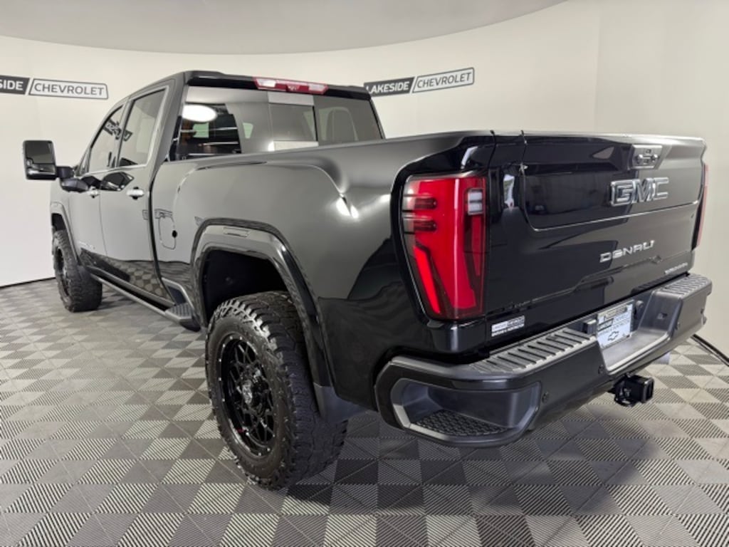 2024 GMC Sierra 2500HD Denali Ultimate Diesel has a one-owner clean CARFAX and is now at Lakeside. This 3/4 ton GMC crew cab Turbocharged diesel pickup has the Duramax 6.6L V8 Turbodiesel engine, 10-Speed Automatic transmission, 4WD, Alpine Umber Leather, spray-on bedliner, power folding auto running boards, heated steering wheel, heated and vented front seats, heated rear seats, wireless Apple Carplay, rear parking camera with HD surround vision, parking sensors, rear view mirror camera, multi-flex tailgate, remote starter, remote tailgate release, garage door transmitters, blind zone alerts, and steering wheel mounted audio controls.