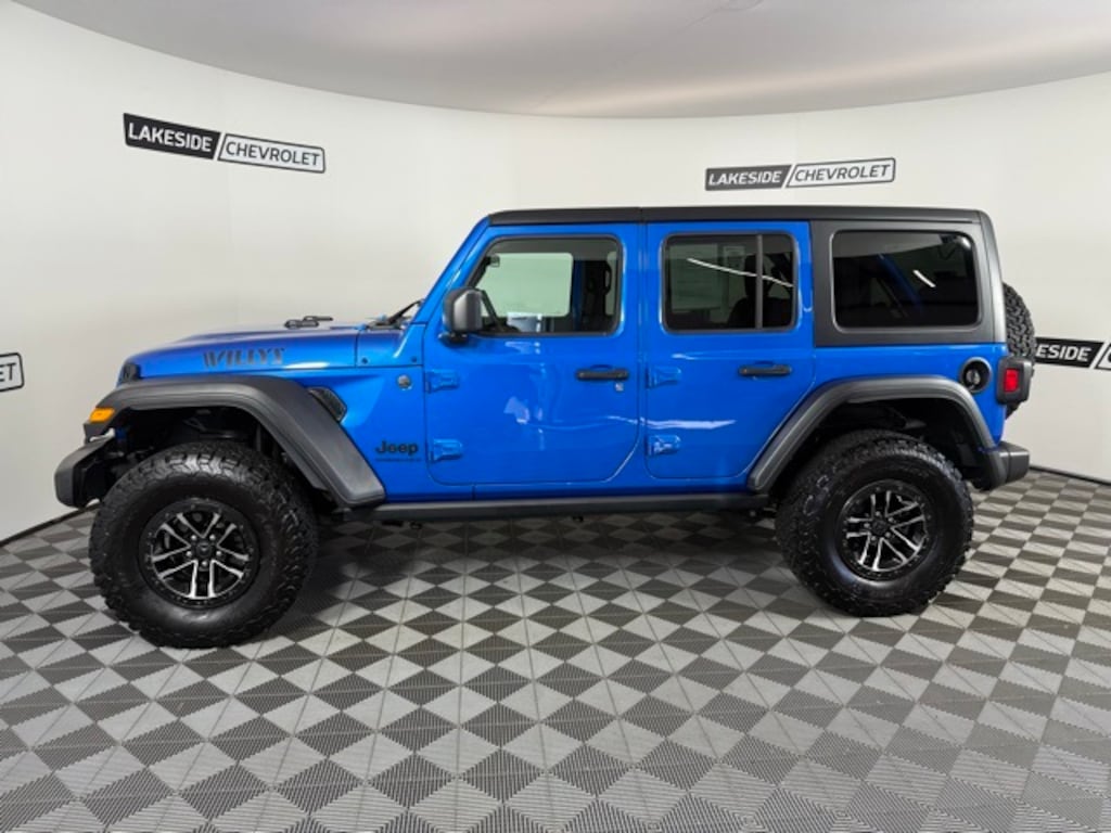 2024 Jeep Wrangler Willys has a clean CARFAX and is now at Lakeside. This Jeep SUV has the 3.6L V6 24V VVT engine, 8-Speed Automatic transmission, heated steering wheel, heated front seats, rear parking camera, wireless Apple Carplay, garage door transmitters, and more.